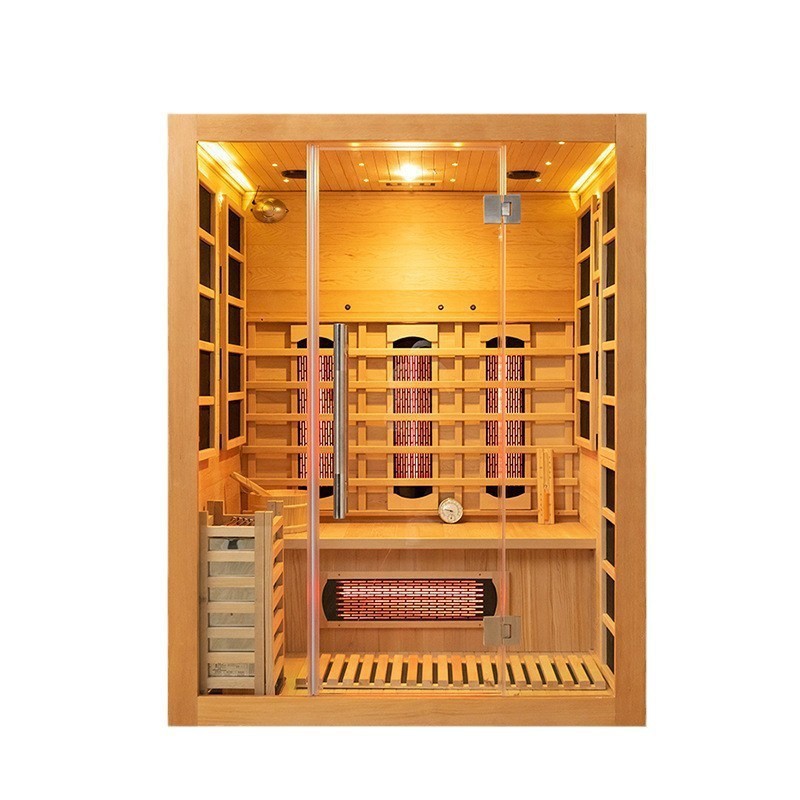 Drevená infračervená a parná sauna pre 1 až 3 osoby je nabitá pokročilými funkciami na zlepšenie vašej wellness cesty: infračervené ohrievače a infračervené grafénové ohrievacie platne (poskytujú rovnomerné a efektívne zahrievanie pre hlboký, relaxačný pot); Ionizátor kyslíka (čistí vzduch vo vnútri sauny a vytvára sviežu a povzbudzujúcu atmosféru); Svetlo na čítanie a reproduktor (umožňuje vám čítať alebo počúvať hudbu a zároveň si užívať saunovanie); Ovládací panel (umožňuje jednoduché nastavenie teploty, času a ďalších nastavení pre personalizovaný zážitok); Sauna Spove & Light Wave Tube (spoločne generujú paru a infračervené teplo, ktoré je vhodné pre milovníkov parnej a infračervenej sauny).