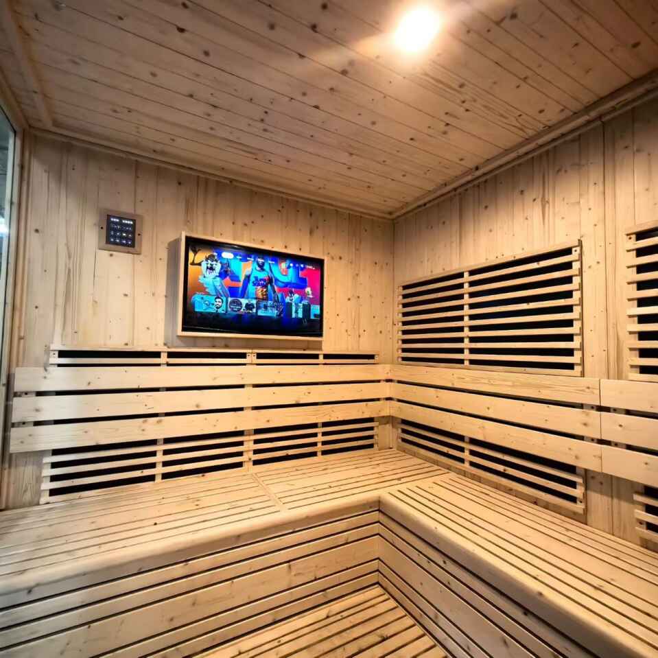 Vstavaný LCD televízor (viditeľný na obrázku) premieňa zážitok zo saunovania:
