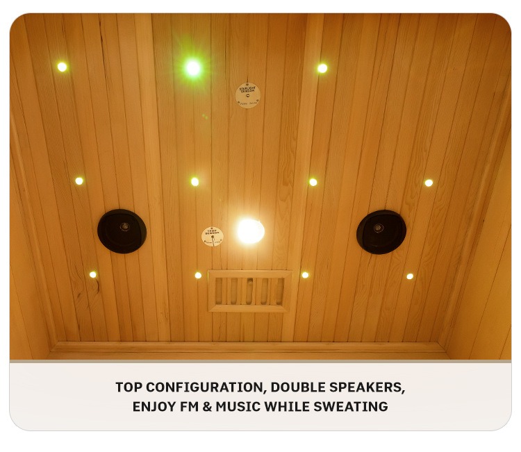V hornej časti je nakonfigurovaný systém dvoch reproduktorov, ktorý podporuje FM rádio a prehrávanie hudby. Počas potenia si môžete vychutnať svoje obľúbené melódie alebo rozhlasové programy, čím si vylepšíte pohlcujúci zážitok zo saunovania.