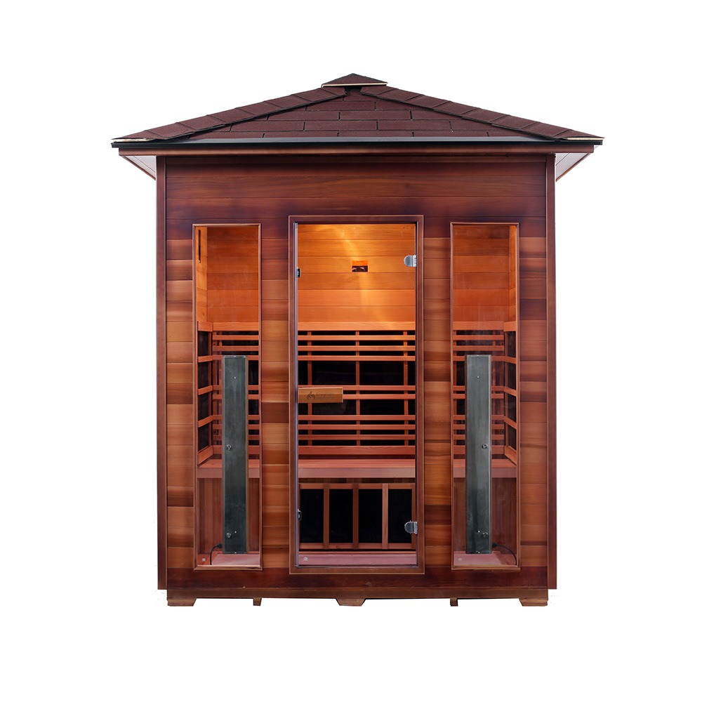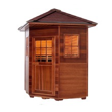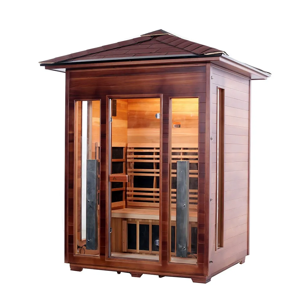 Táto vonkajšia sauna je vyrobená z kanadského západného červeného cédra alebo kanadského jedľa. Drevo sa môže pochváliť odolnosťou proti korózii a vlhkosti, ako aj štrukturálnou stabilitou. Vybavený technológiou vykurovania z uhlíkových vlákien s diaľkovým infračerveným žiarením, rýchlo sa zahrieva a rovnomerne rozvádza teplo. Vhodné pre vonkajšie prostredie, ako sú nádvoria, balkóny, vilové záhrady, oblasti pri bazénoch a letoviská.